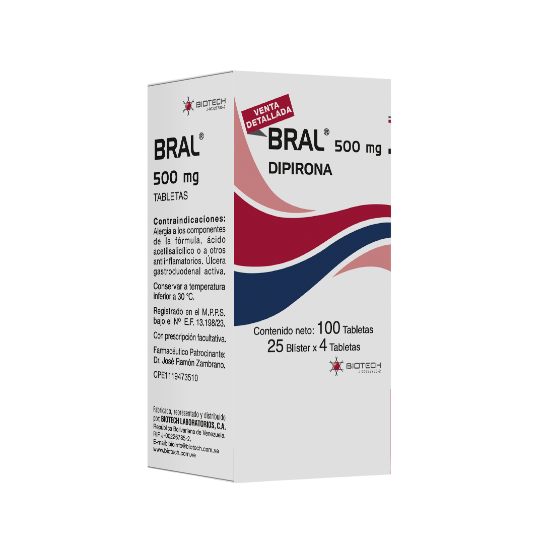 Cada tableta contiene: 500 mg de Dipirona; en estuche con 20 tabletas y dispensador con 25 blísters contentivos de 4 tabletas cada uno.