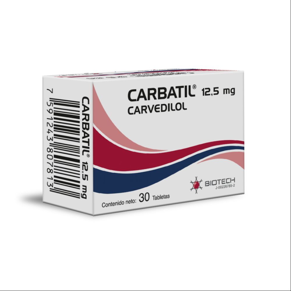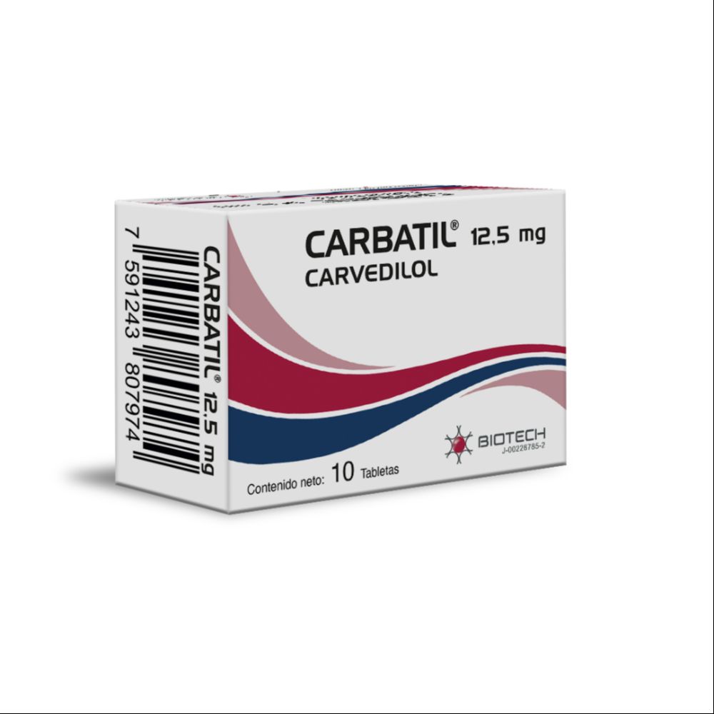 Cada tableta contiene: 12,5 mg de Carvedilol, 18,452 mg de Azúcar, 47 mg de Lactosa; en estuches con 10 y 30 tabletas.