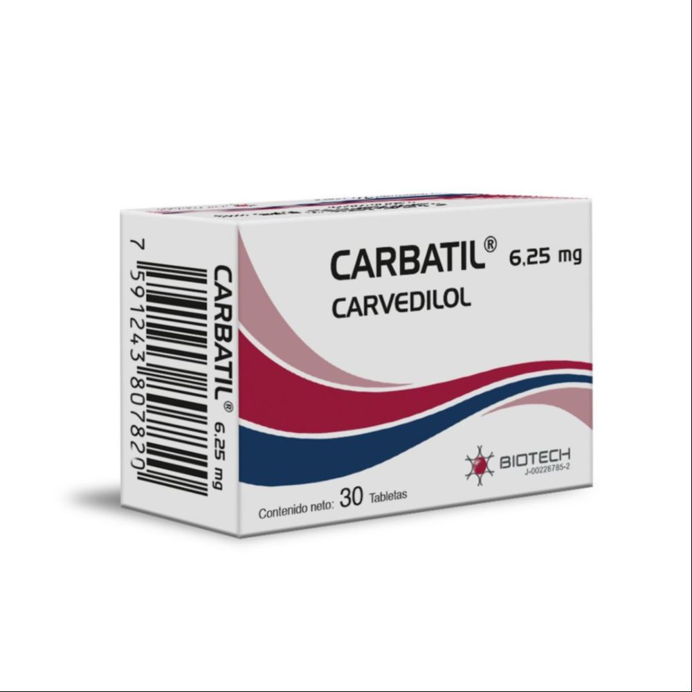 Cada tableta contiene: 6,25 mg de Carvedilol, 20,75 de Azúcar, 51 mg de Lactosa; en estuches con 10 y 30 tabletas.