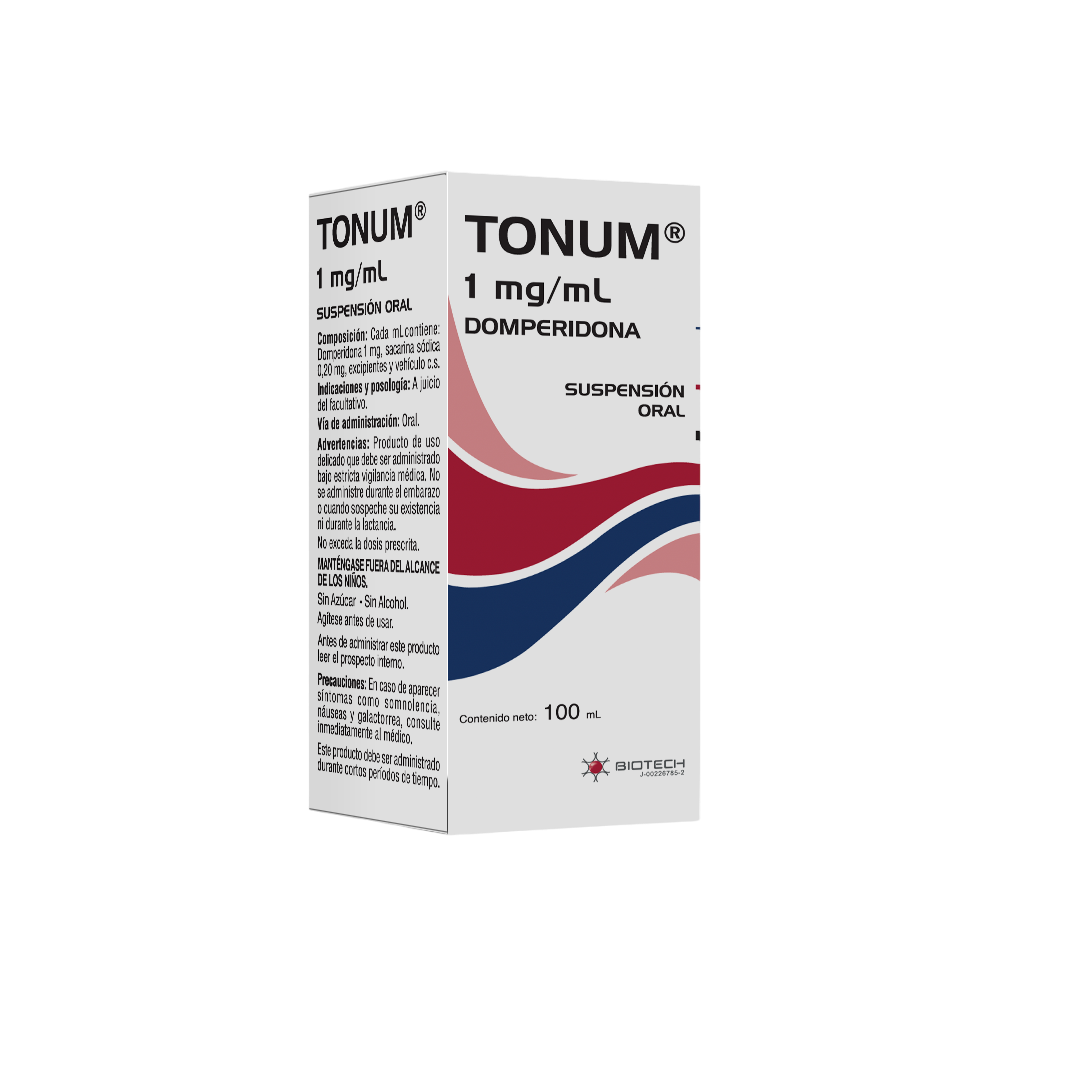 Cada mL contiene: 1 mg/mL de Domperidona; en estuche con frasco contentivo de 100 mL y copita dosificadora.
